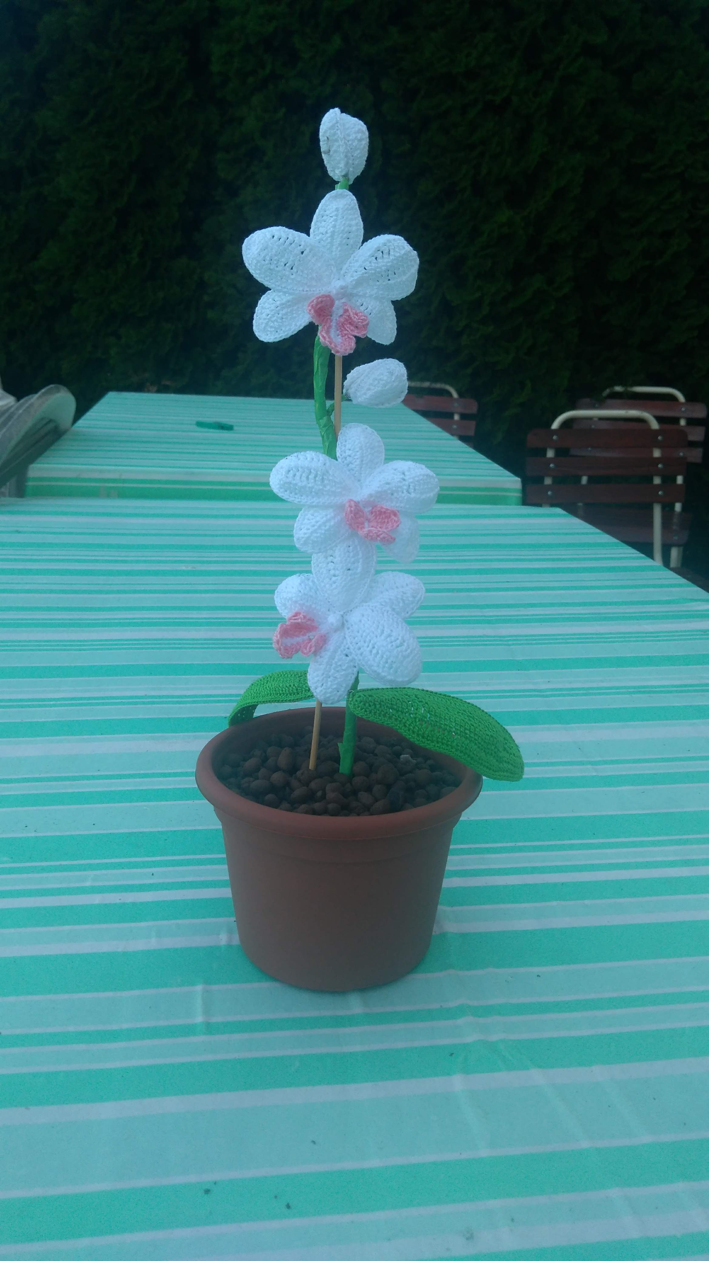 Ručne háčkovaná orchidea. Použitá priadza Maxi, dekoračný drôt, koflík, dekoračný kolík na udržanie orchidey, farby: biela, zelená, ružová. Výška cca 30 cm.